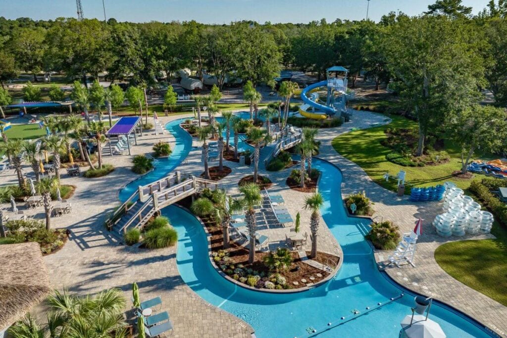 This one is a bit different from the typical lazy river campground because it’s not just a campground with a pool added on. It’s basically a full adventure park that happens to have RV sites.